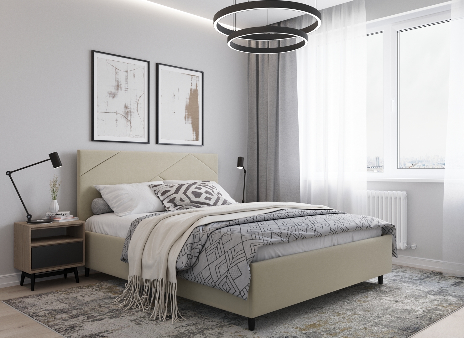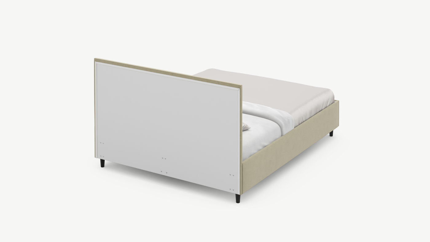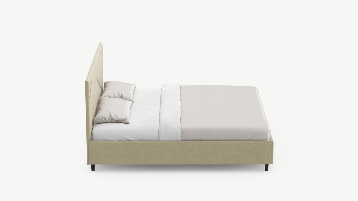 Элегантным и практичным акцентом служат скрытые карманы, расположенные по его углам. Лаконичные формы объемных царг создают единый гармоничный образ и фокусируют внимание на центральном текстурном элементе кровати.