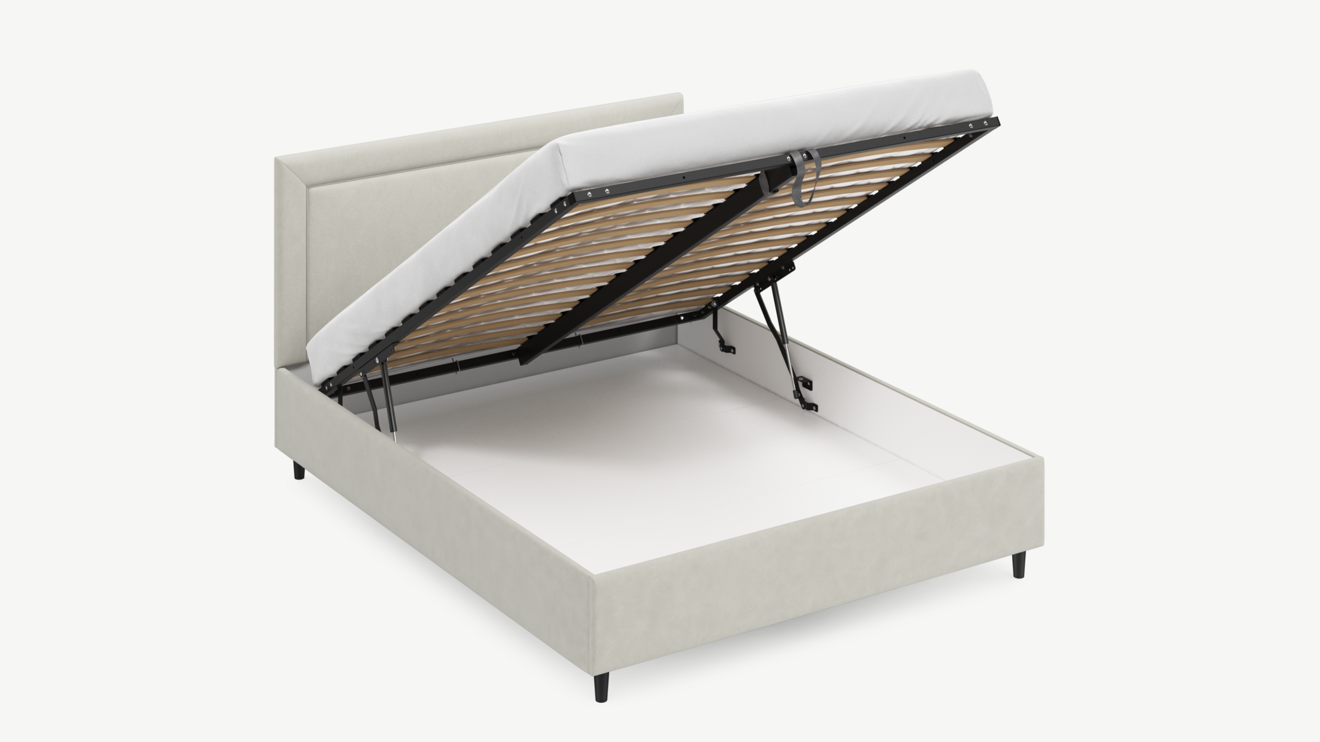 Вместительная емкость под кроватью без внутренних перегородок позволяет использовать для хранения вещей 100% пространства.