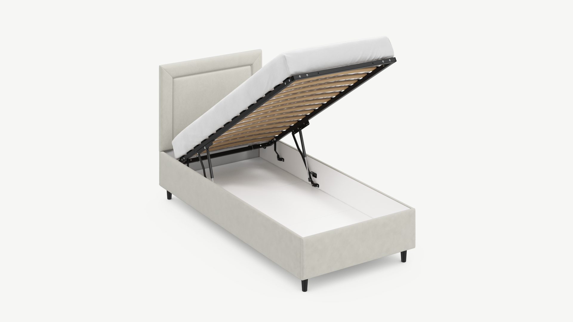 • Скрытая под основанием вместительная емкость без внутренних перегородок позволяет использовать всю площадь подкроватного пространства для хранения вещей.