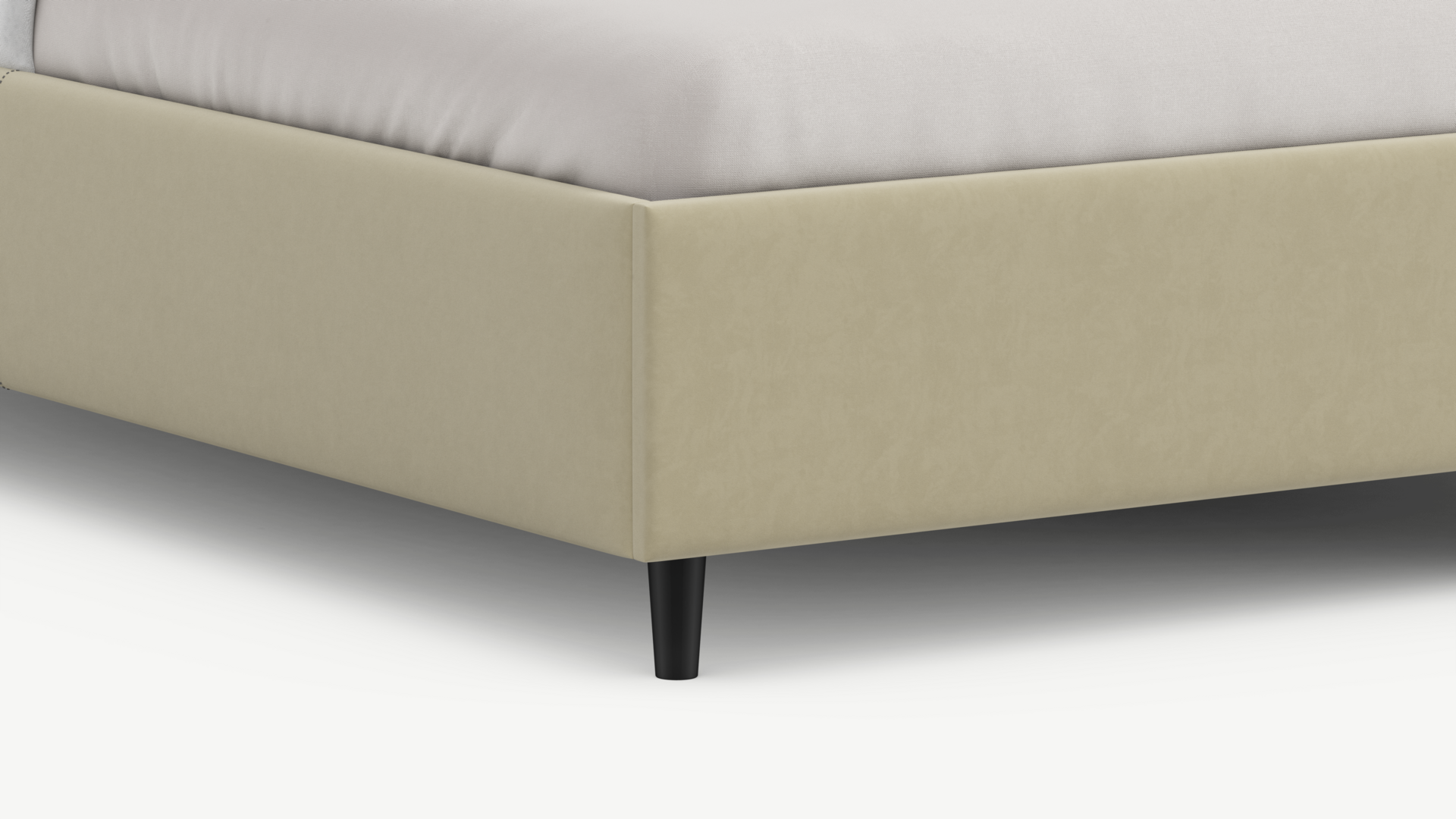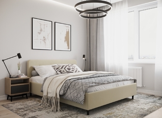 Царга, задающая пропорции, благодаря гладкости своей фактуры подчеркивает центральный элемент декора. Высокие опоры приподнимают фигуру кровати над полом и добавляют её образу визуальной легкости.