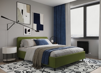 Царга, задающая пропорции, благодаря гладкости своей фактуры подчеркивает центральный элемент декора. Высокие опоры приподнимают фигуру кровати над полом и добавляют её образу визуальной легкости.