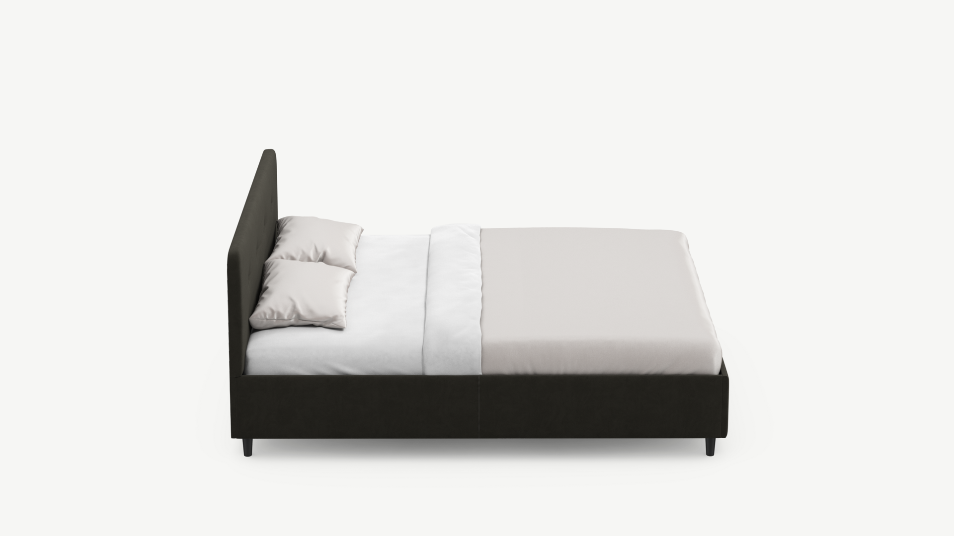 Царга, задающая пропорции, благодаря гладкости своей фактуры подчеркивает центральный элемент декора. Высокие опоры приподнимают фигуру кровати над полом и добавляют её образу визуальной легкости.