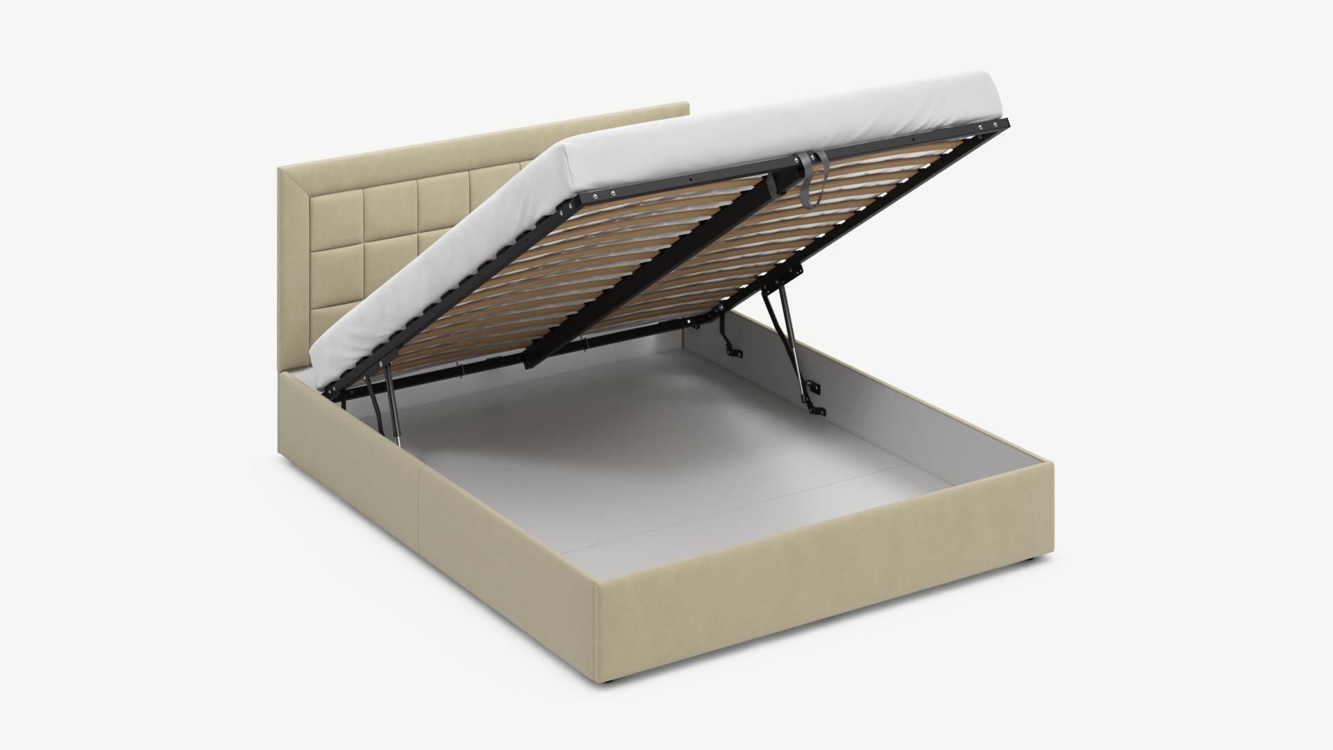 Вместительная емкость под кроватью без внутренних перегородок позволяет использовать для хранения вещей 100% пространства.