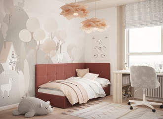 Угловая односпальная кровать MOON FAMILY 1261 с мягкой спинкой и изголовьем создаст в Вашей спальне ощущение уюта. Крупная квадратная стежка привносит в интерьер графических акцентов, а вставка из пуговиц наполняет пространство ощущением домашнего тепла.