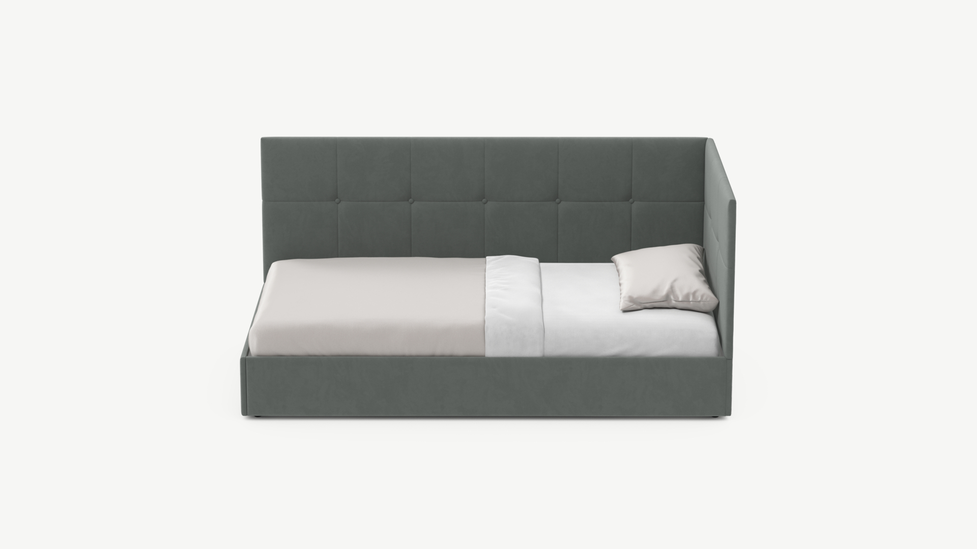 Угловая односпальная кровать MOON FAMILY 1261 с мягкой спинкой и изголовьем создаст в Вашей спальне ощущение уюта. Крупная квадратная стежка привносит в интерьер графических акцентов, а вставка из пуговиц наполняет пространство ощущением домашнего тепла.