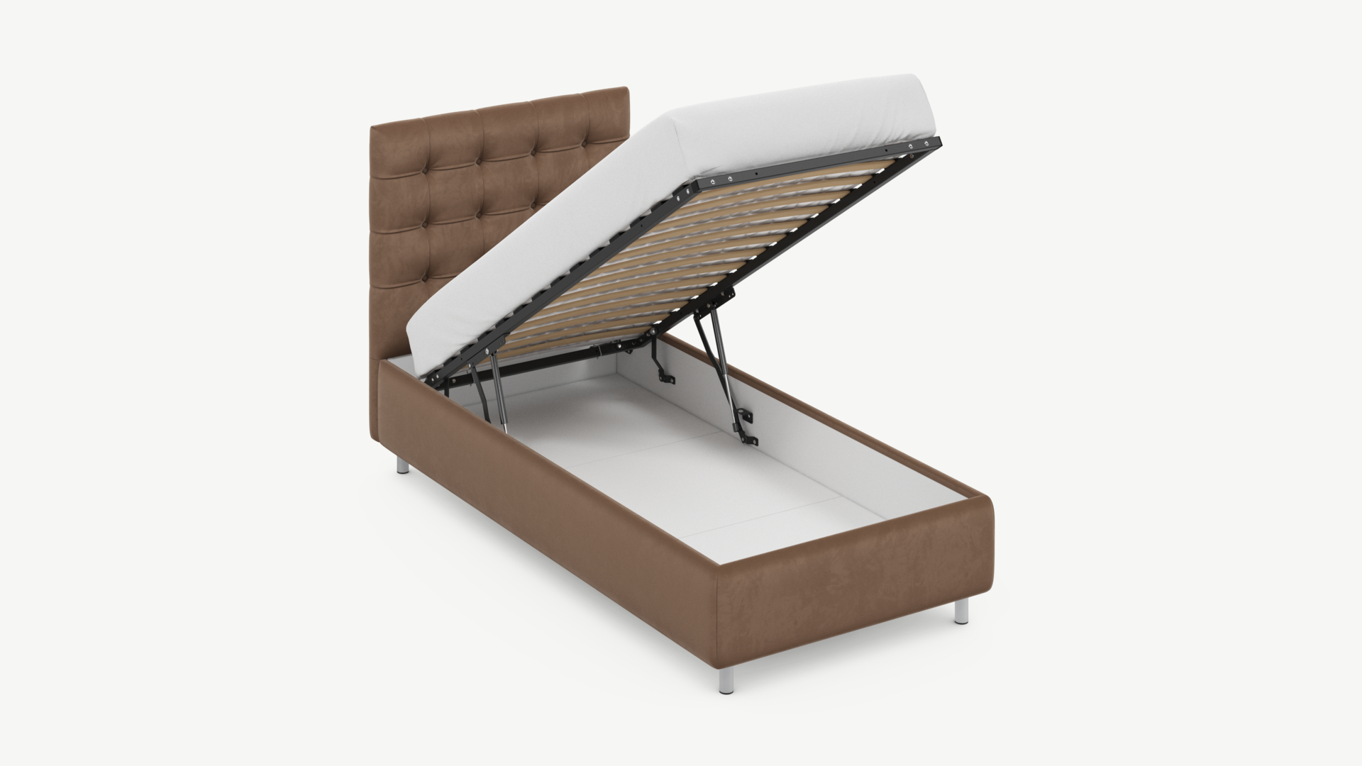 • Скрытая под основанием вместительная емкость без внутренних перегородок позволяет использовать всю площадь подкроватного пространства для хранения вещей.